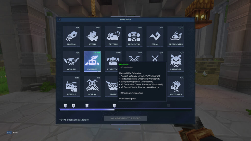 J’ai déposé un peu plus de 100 « mémoires » dans le temple oublié. Ainsi j’ai débloqué le quatrième coffre qui apporte des bonus et de nouvelles recettes.