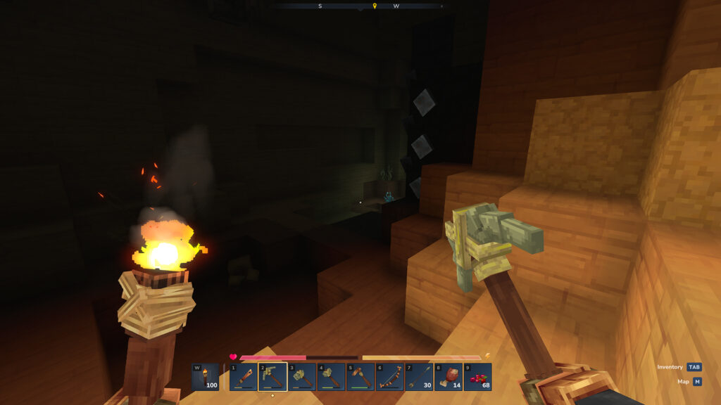 Après un très long périple bien loin de ma base principale, j’ai enfin trouvé du fer ! Primordial pour améliorer l’établi en Tiers 2. Et donc primordial pour fabriquer une table d’alchmiste… Pour fabriquer des téléporteurs… Les cheveux ne sont pas simples à appréhender alors ça va m’aider à aller récolter des trucs à divers endroits.